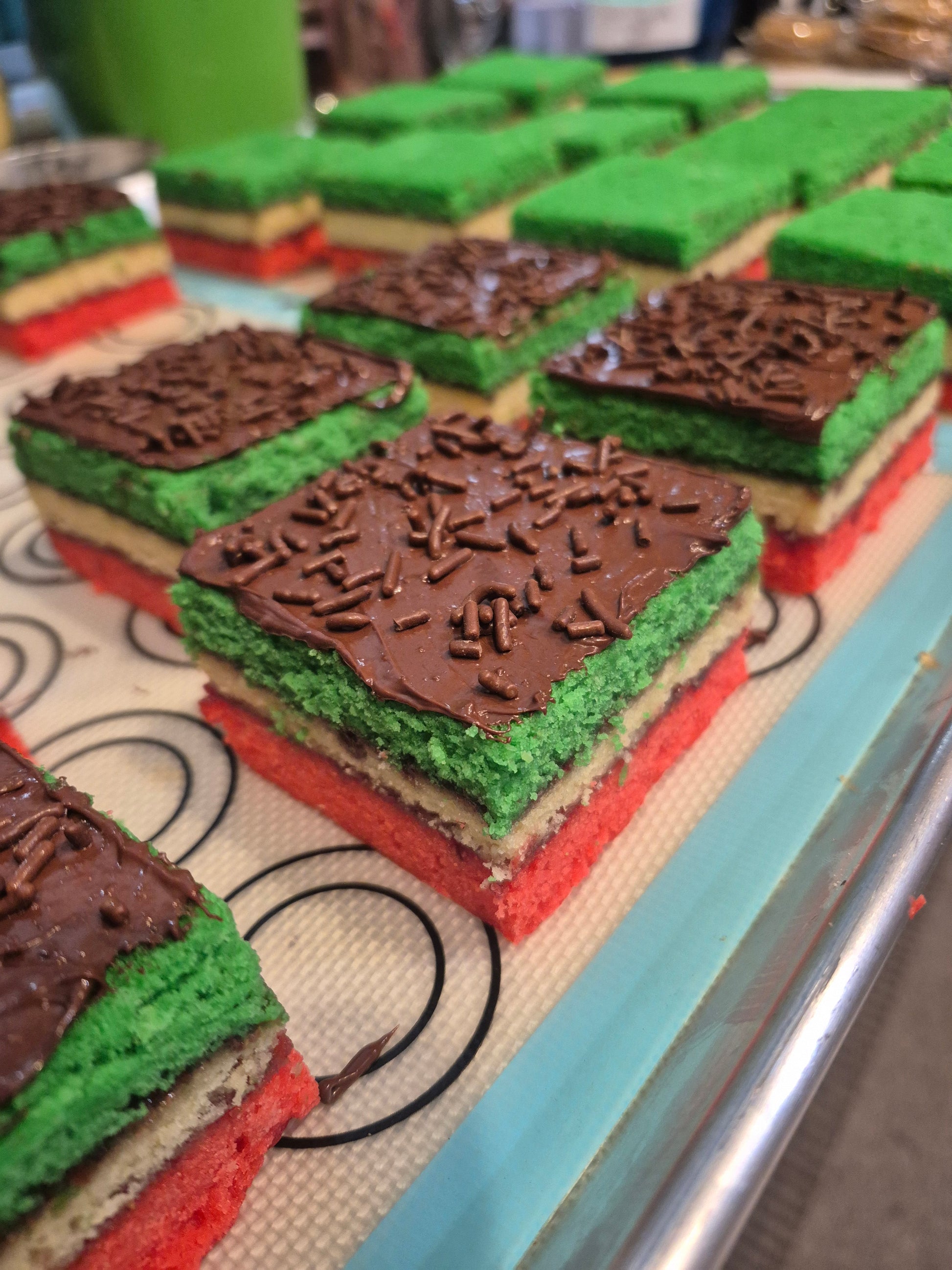 Handcrafted Tri-Color/Rainbow Cookies with almond sponge, raspberry jam, and chocolate coating. Includes 4 cookies (total 5 oz min). Perfect for gifts, parties, or celebrations.